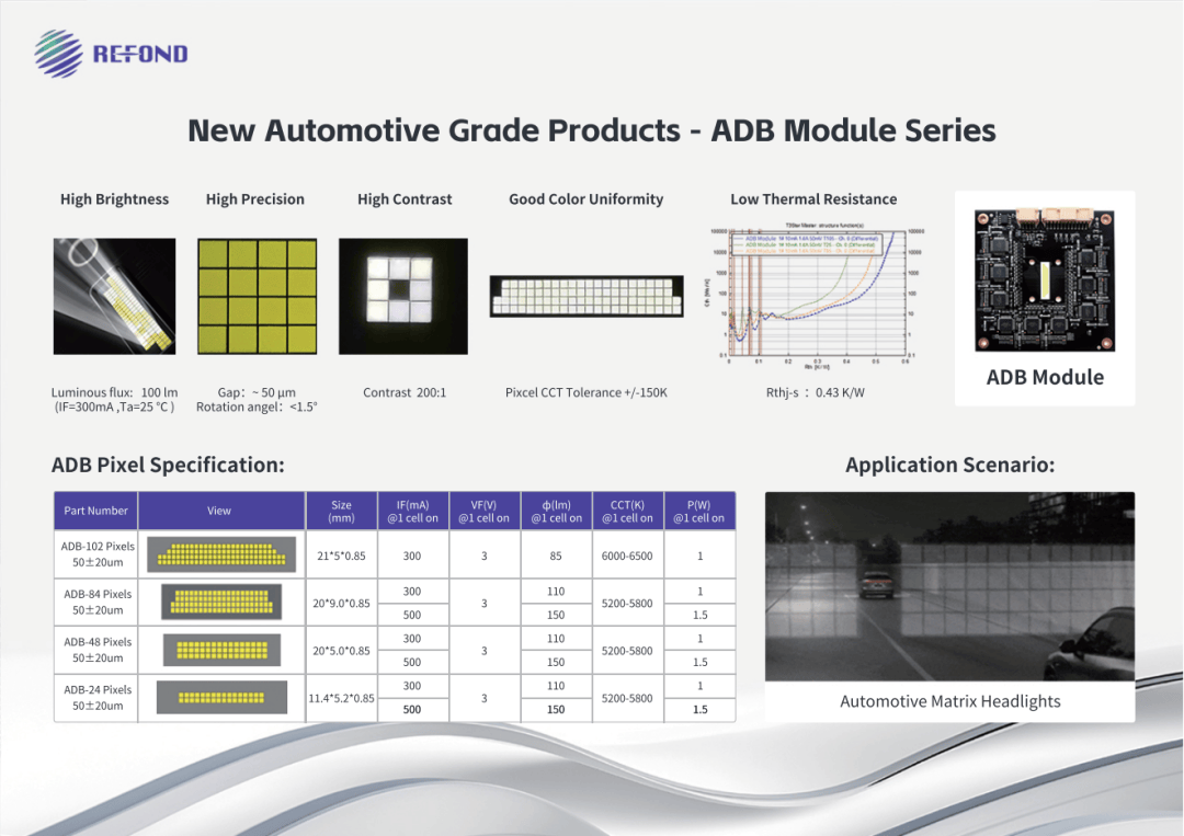 在自适应远光灯方面,瑞丰光电带来了支持16/24/36/48/84/102不同像素解决方案的车规级ADB矩阵光源模组,可灵活适配不同车型定位与设计需求,依托微米级像素间距的精细分区照明能力,能够实现全路况下的精准光束控制;在动态规避眩光的同时,为驾驶员提供最佳照明效果,进而提升行车安全性。