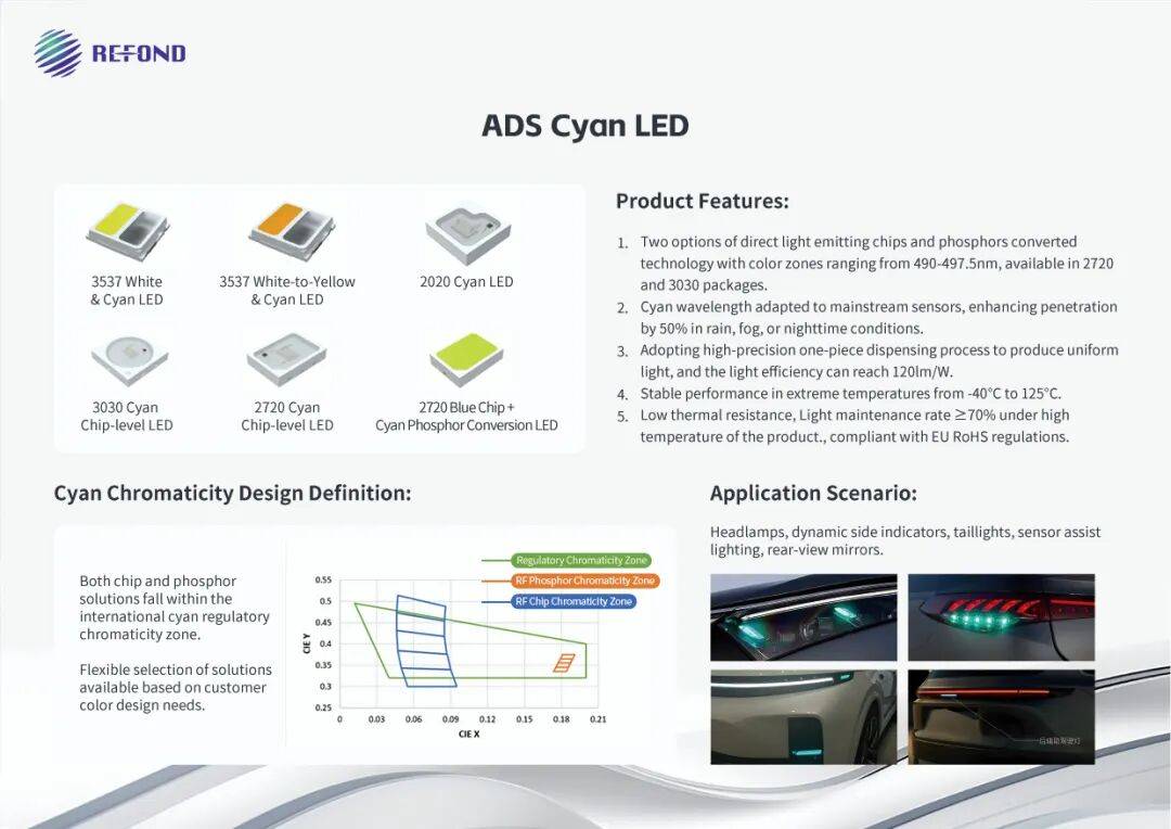 聚焦车辆环境感知增强与道路环境协同通信,本次研讨会瑞丰光电展出的ADS Cyan 蓝绿光LED,采用直发光芯片/荧光粉双技术路线,打造高辨识度与可见度智驾标识,涵盖主波长490-497.5NM,在雨雾/夜间穿透力提升30%,可适用前照灯、传感器辅助光源及V2V信号标识场景,且符合欧盟ROHS认证。